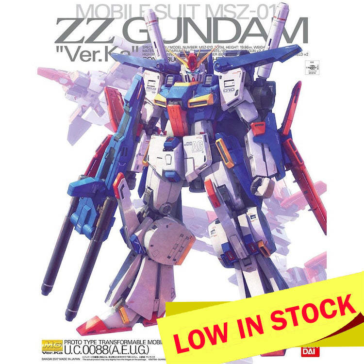 The next mobile suit to make its way to the Master Grade line-up is the ZZ Gundam Ver. Ka, as part of the 30th anniversary of "ZZ Gundam!" ! This newly designed version, overseen by renown mecha designer Hajime Katoki, is based around the elongated proportions in the Enhanced ZZ and Full Armor ZZ Gundam variants that appeared in the latter half of the anime series "ZZ Gundam". The ZZ Gundam Ver. Ka. is fully transformable! Combine the Core Base, Core top, and Core Fighter to create the G-Fortress! Mechanical detailing in the shoulders, knees, and waist utilize improved joints and sliding mechanisms for even more dynamic posing capabilities. Certain parts feature a special finish to further hi-light certain aspects of the kit.