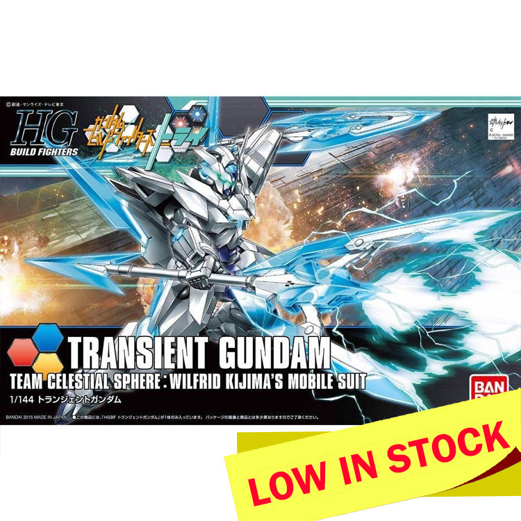 Based on Gundam Build Fighters Honoo, this model kit of Transient Gundam is in 1/144 scale and becomes a fully articulated figure once complete. The model kit includes two giant lances and features a white an blue color scheme.